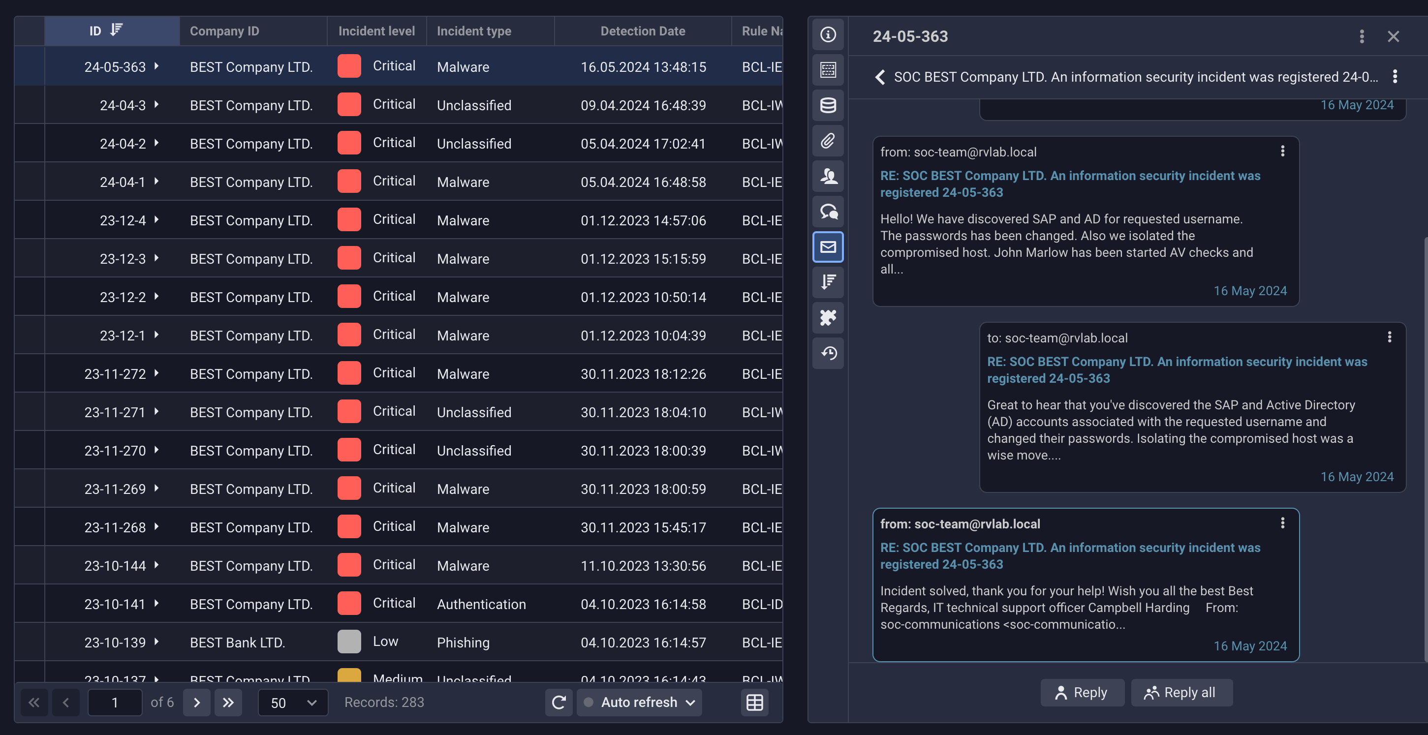 Built-in integration with the e-mail server helps to engage external employees or experts to incident investigation and send them requests for information directly from Defensys SOAR console. The history of communication as well as attached documents and materials will be saved and added to the incident desription.