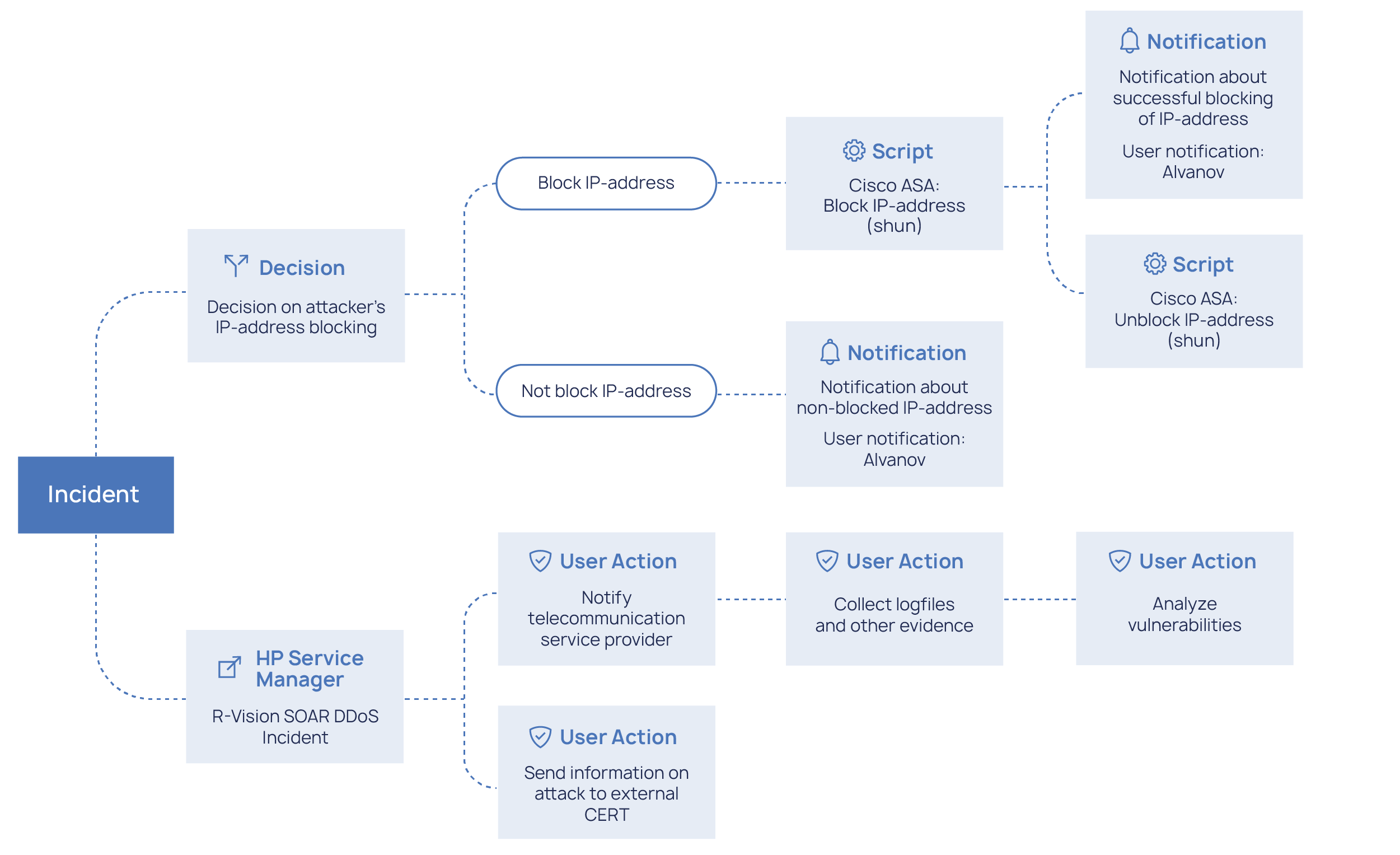 Defensys SOAR offers adjustable built-in dynamic playbooks which allow specifying a sequence of actions for the particular incident type that will be executed in case of an alert automatically. Playbooks can contain multiple action variants with automated, manual or mixed decision-making.