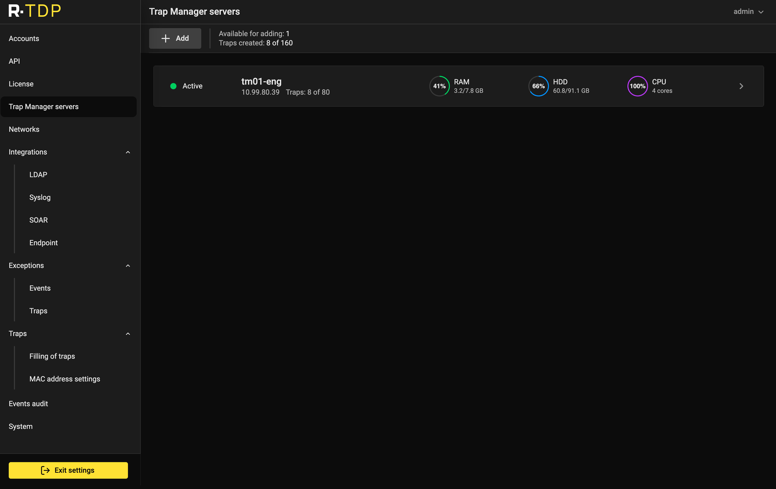 Using a combination of traps and lures, Defensys TDP detects the presence of a cybercriminal or malware, delays its progress within the network by confusing it with fake objects, and enables cybersecurity specialists to stop the development of an attack before it leads to a significant damage. Traps are hosted on separate Trap Manager servers, while the platform and the entire emulated infrastructure are managed on the Control Center server. Control Center server is the place where security events are collected and processed, interaction with external systems is provided, and traps, lures and Trap Manager servers are managed. For large organization infrastructures, the scaling task is easily solved by adding the required number of Trap Manager servers.